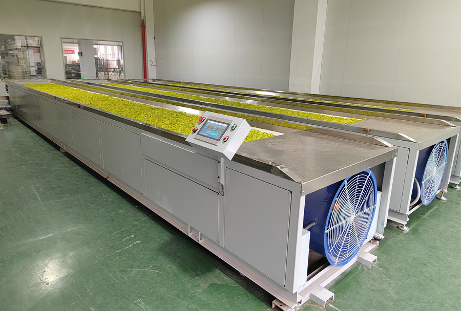 作業(yè)原理:?jiǎn)螌邮浇Y構,機組采用的集中控制系統可精準控制鼓風(fēng)時(shí)間、風(fēng)量、溫度、攤葉厚度/重量等主要參數,實(shí)現攤青(萎凋)的均勻充分。 利用光電定位系統,能有效檢測茶葉流量,可自動(dòng)控制茶葉進(jìn)入下一步工藝流程。
